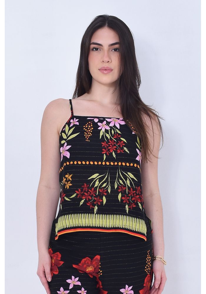 Confeccionada em tecido leve e confortável, esta blusa traz estampa floral vibrante que combina modernidade e delicadeza. Possui alças finas com regulagem para melhor ajuste e caimento soltinho, garantindo frescor e estilo em qualquer ocasião. Uma peça versátil para compor desde looks casuais até produções mais sofisticadas.