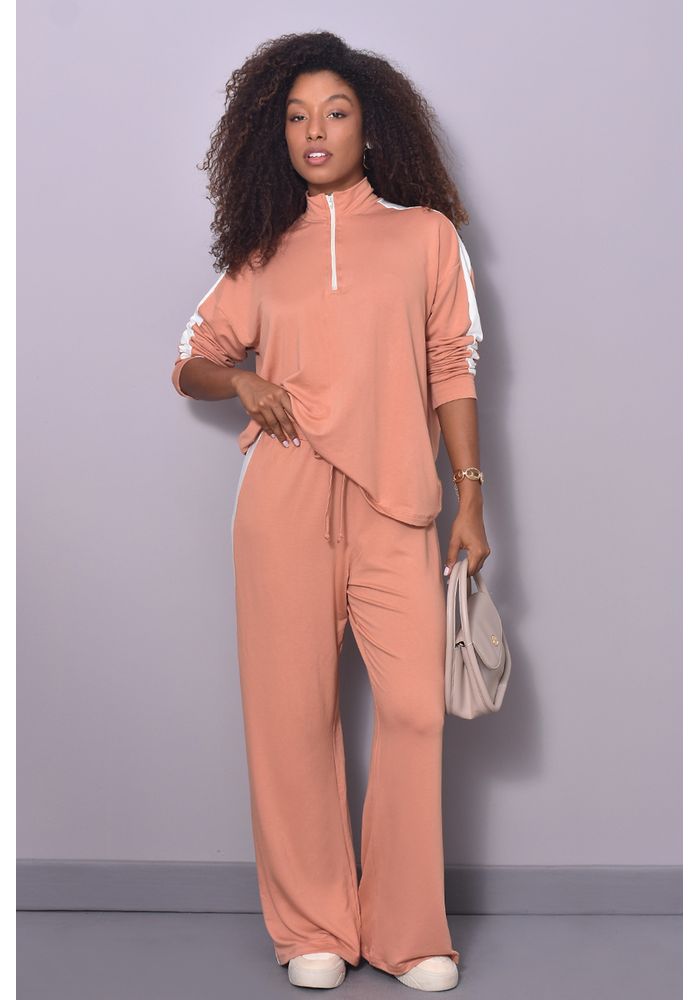 O conjunto em moletinho com casaco e calça oferece caimento leve e apresenta recortes em contraste, proporcionando um visual moderno com toque esportivo. O destaque fica por conta do decote em zíper no casaco, que permite diferentes formas de uso: fechado, para um look mais sóbrio, ou aberto, para um toque mais despojado. A calça, com cintura alta e elástico, tem caimento soltinho que garante conforto e liberdade de movimento. É um look prático, versátil e cheio de atitude, ótimo para usar junto ou separado!
