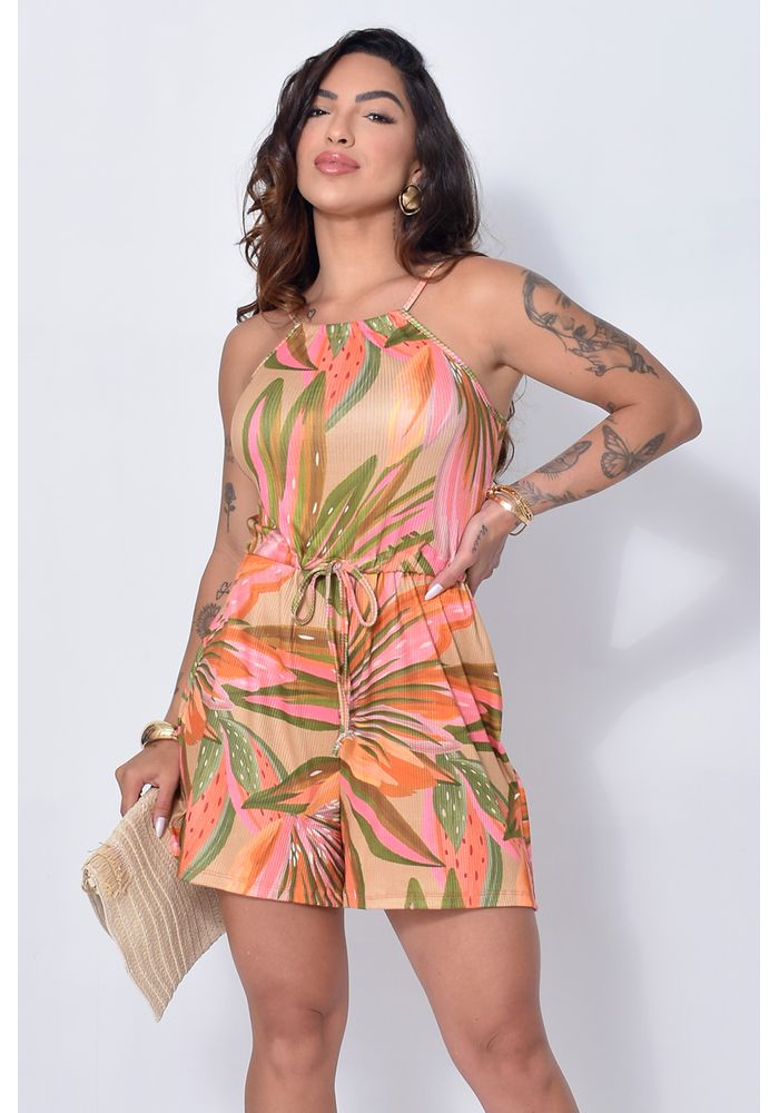 Macaquinho estampado com modelagem leve e confortável, ideal para os dias quentes. Possui decote mais fechado, alças finas e amarração na cintura que ajusta o caimento ao corpo. O tecido em ribana canelada garante elasticidade, frescor e liberdade de movimento. Uma peça prática e versátil, perfeita para produções do dia a dia.