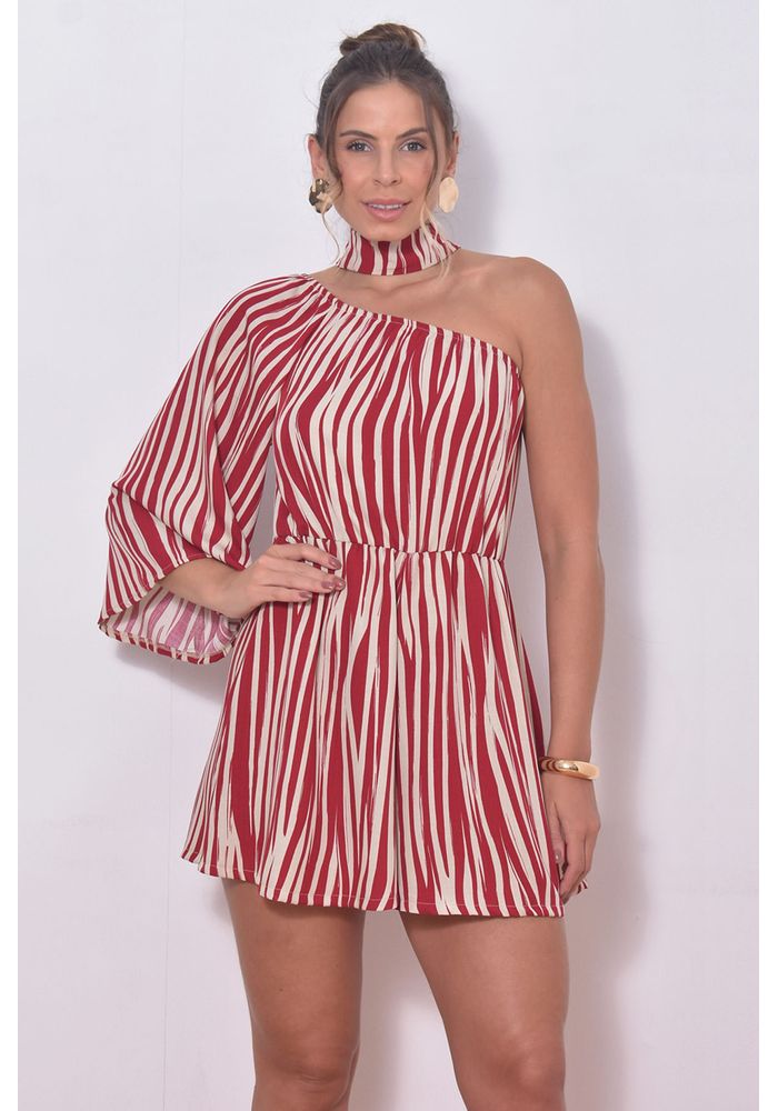 O macaquinho estampado de viscose com um ombro só apresenta uma estampa vibrante em tons de vermelho e off-white. O macaquinho se destaca pelo design assimétrico com uma manga única, que confere um toque de originalidade ao visual. A manga bufante adiciona um volume elegante. A faixa de amarração permite ajustar o caimento da peça, realçando a silhueta de forma delicada