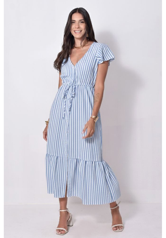 Leve e fácil de usar, esse vestido midi listrado traz um visual delicado e bem feminino. O decote em V valoriza o colo, enquanto os botões frontais deixam a peça prática e cheia de charme. A amarração na cintura ajuda a ajustar o caimento ao corpo, e a saia midi com movimento garante conforto no dia a dia. Uma opção versátil para usar do trabalho ao passeio, com rasteira, sandália ou salto leve.