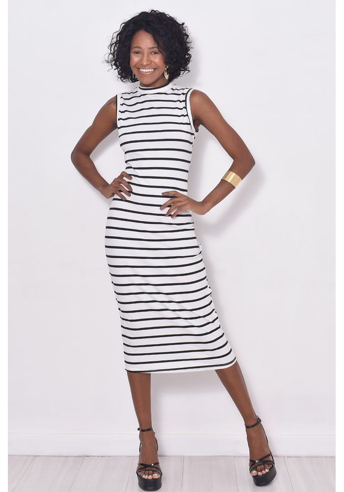 O vestido midi em ribana apresenta modelagem ajustada ao corpo, valorizando as curvas sem abrir mão do conforto. O comprimento midi traz sofisticação, enquanto as listras horizontais adicionam um toque moderno e atemporal. A gola alta sem mangas imprime uma pegada urbana e versátil, sendo perfeita para criar composições que vão desde a proposta casual à sofisticada. Confeccionado em malha canelada, o vestido ribana oferece um caimento perfeito e toque macio. Um vestido prático, estiloso e fácil de combinar para diversas ocasiões.