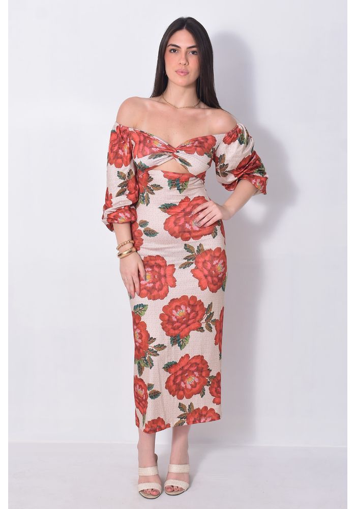 Vestido feminino midi estampado em malha suede. Confeccionado em malha suede, o vestido oferece um toque aveludado e um visual sofisticado, com caimento estruturado que valoriza a silhueta com conforto e elegância. A estampa floral maxi sobre fundo bege garante um ar refinado, enquanto o floral vibrante adiciona personalidade à peça. O decote torcido no busto acrescenta charme e valoriza o colo de forma delicada. Logo abaixo, um recorte sutil e estratégico proporciona um toque moderno com elegância. A modelagem midi finaliza o look com equilíbrio e fluidez, sendo perfeita para ocasiões que pedem sofisticação com conforto.